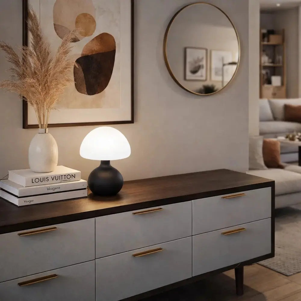 Compact en elegant, de Paddenstoel Nachtlamp creëert een fluweelachtige halo die de sfeer van de kamer onmiddellijk verzacht. Ideaal als tafel- of nachtlamp, combineert het hedendaagse stijl met comfortabele verlichting.